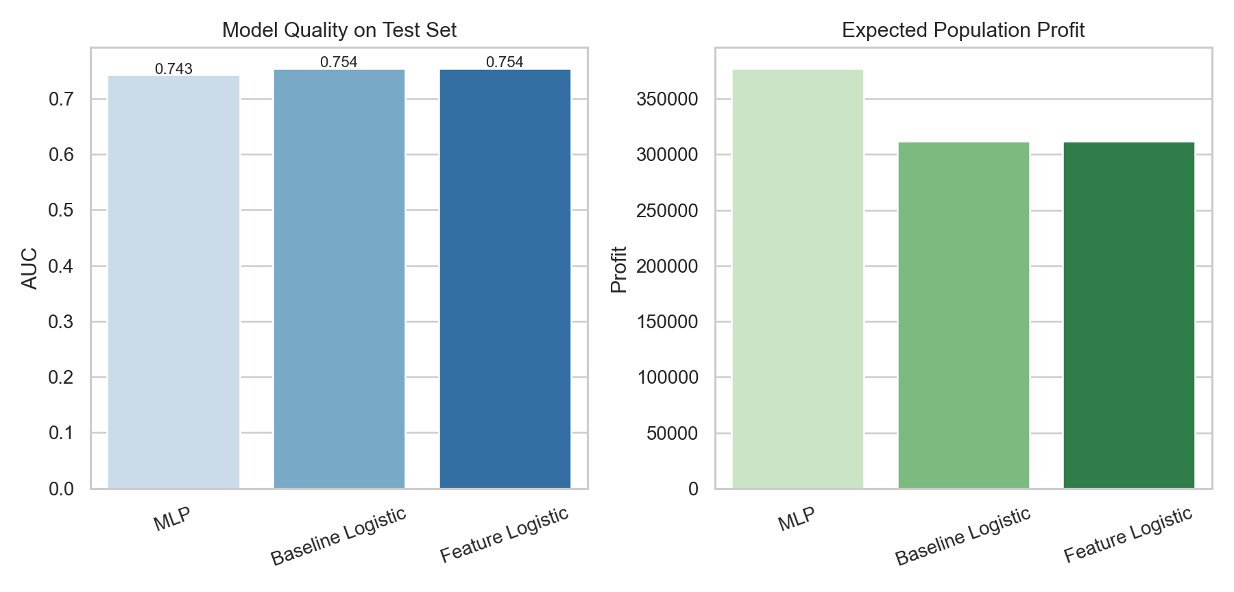 The feature-engineered logistic regression remained attractive because it was easier to explain, and its AUC was marginally better. But for operational targeting, the MLP produced the highest expected profit, which made it the better execution model in this specific setting.