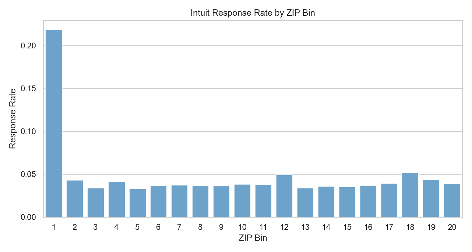 One simple exploratory result from the notebook was especially revealing: ZIP-code buckets had highly uneven response behavior. In the sample, the top ZIP bin was a dramatic outlier, which suggests there was real geographic structure in upgrade propensity rather than pure noise.